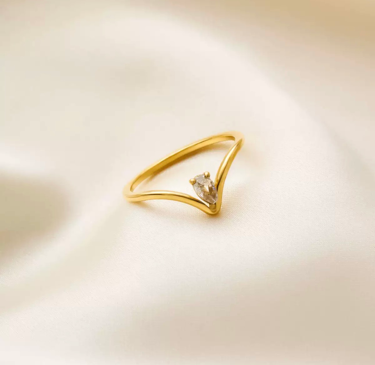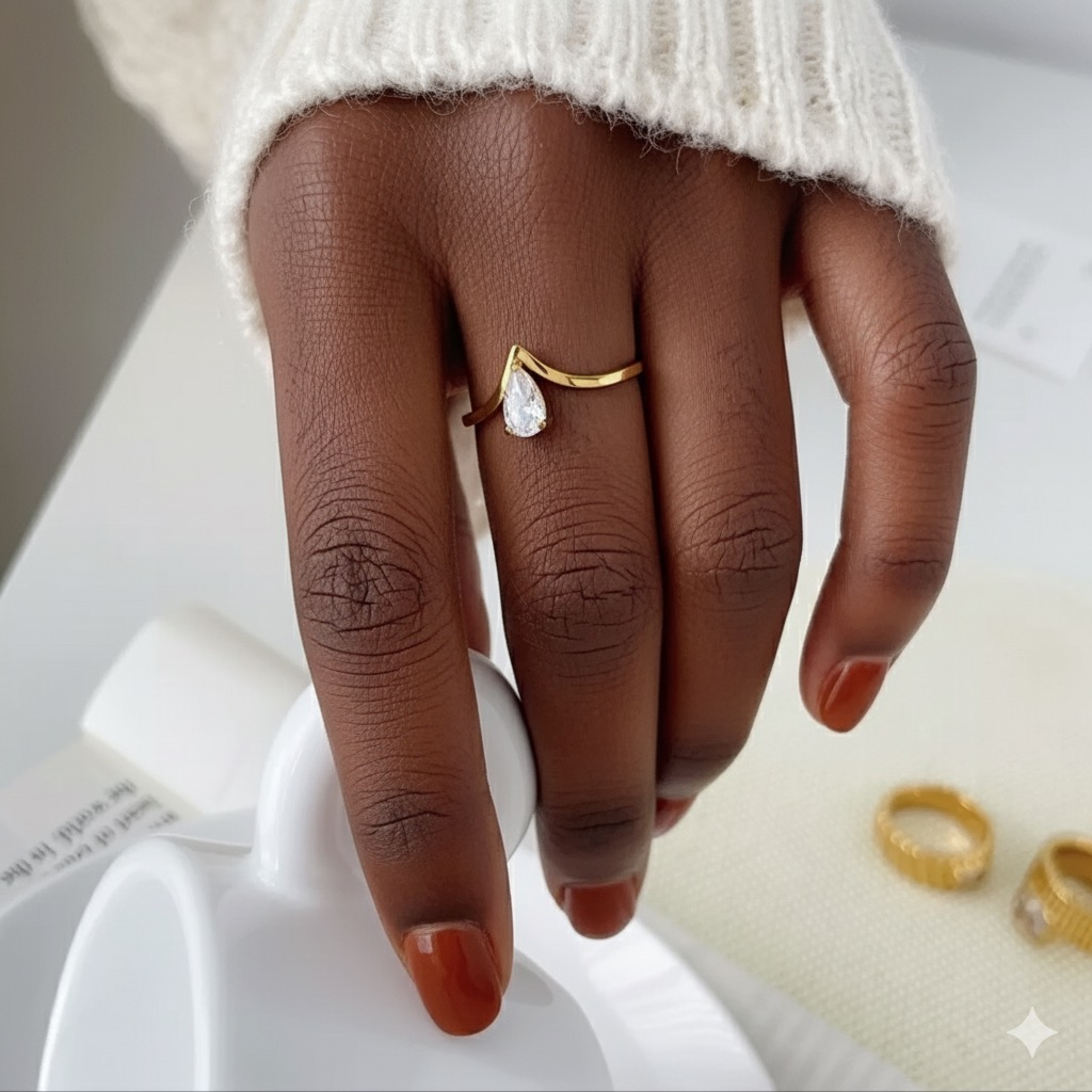 The Celestial Drop Ring is a delicate promise of elegance and light. Featuring a radiant teardrop stone cradled within a graceful golden arc, it captures a sense of quiet beauty and refined charm. Designed to shine on its own or stack effortlessly with other rings, this piece lets you create your own constellation — subtle, personal, and endlessly enchanting.