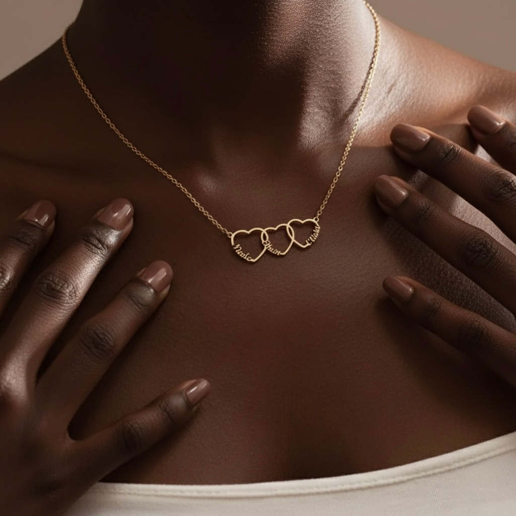 Connected by love and finished with intention, this piece is created for the woman who carries her world with her — her memories, her relationships, her story. Each gold-finished heart is thoughtfully customized, symbolizing the moments, names, and connections that shape her journey.